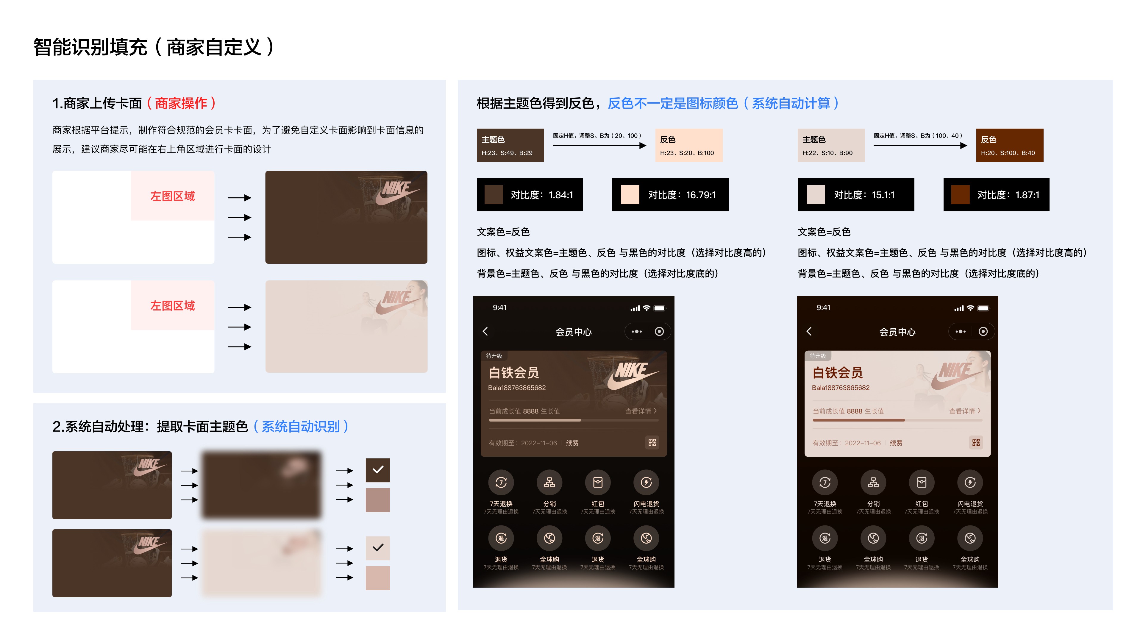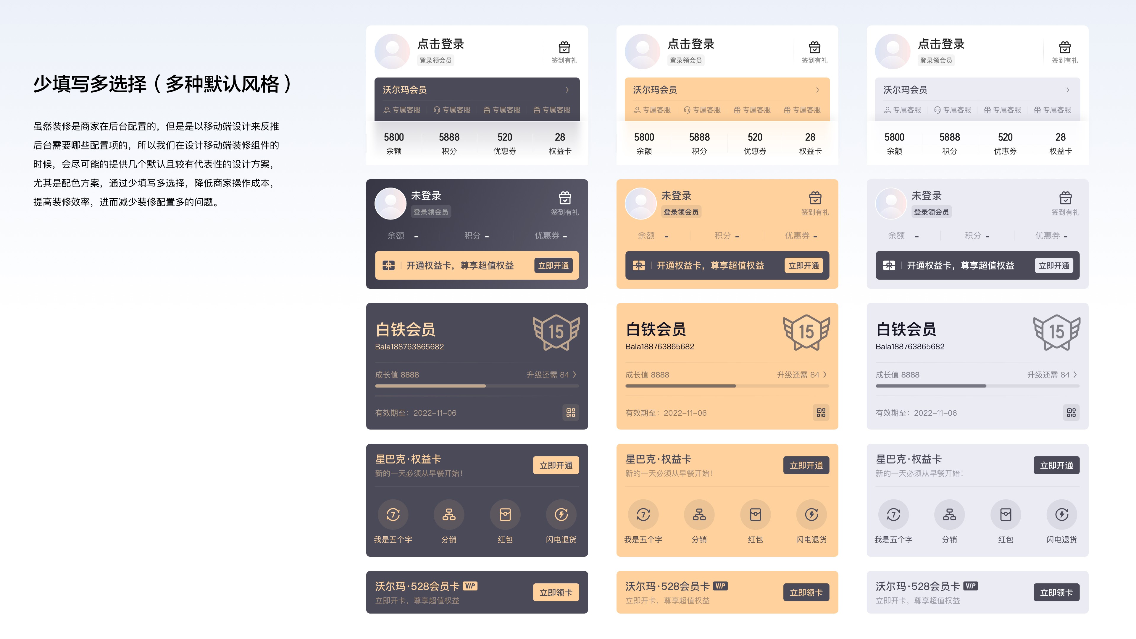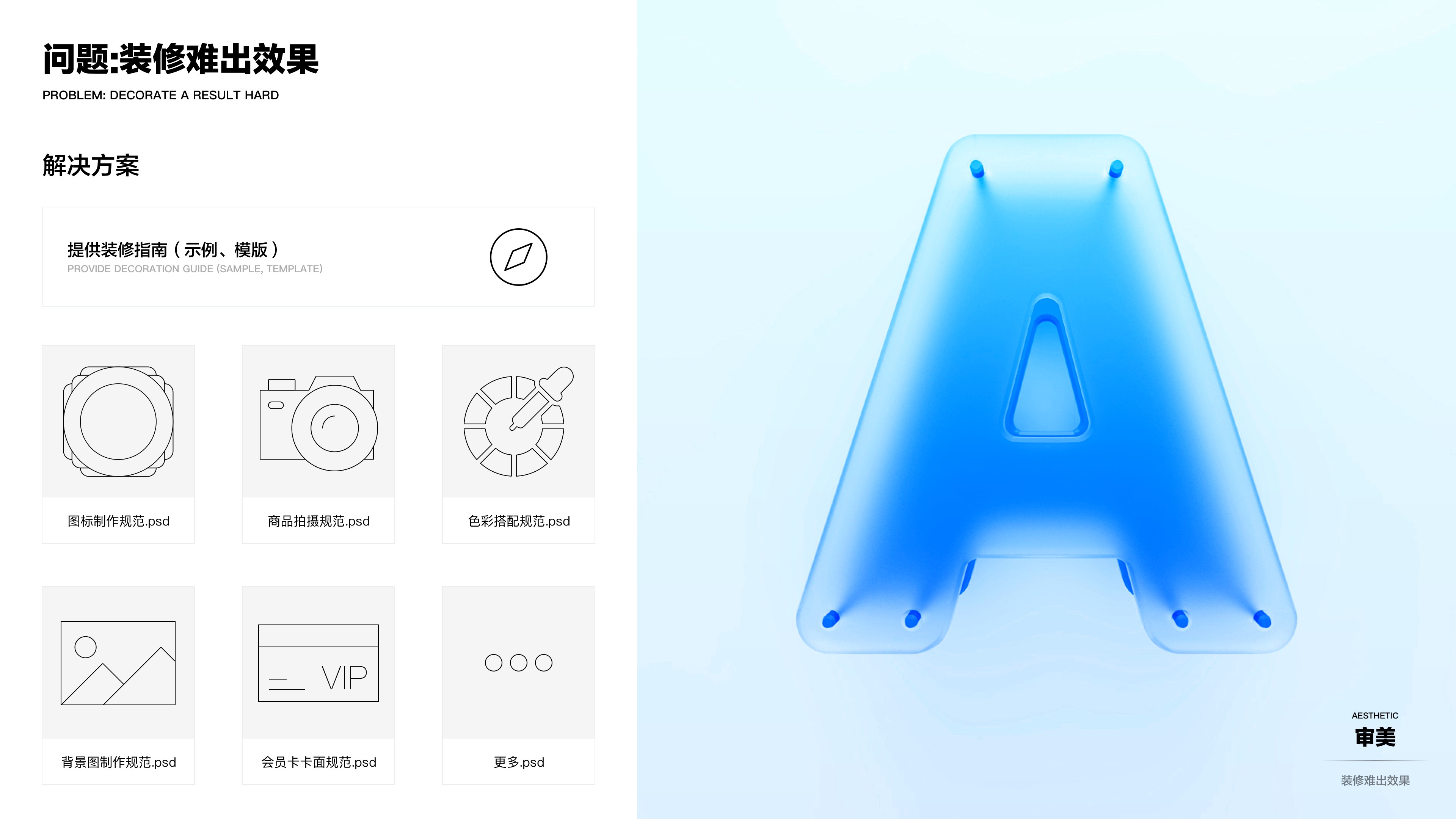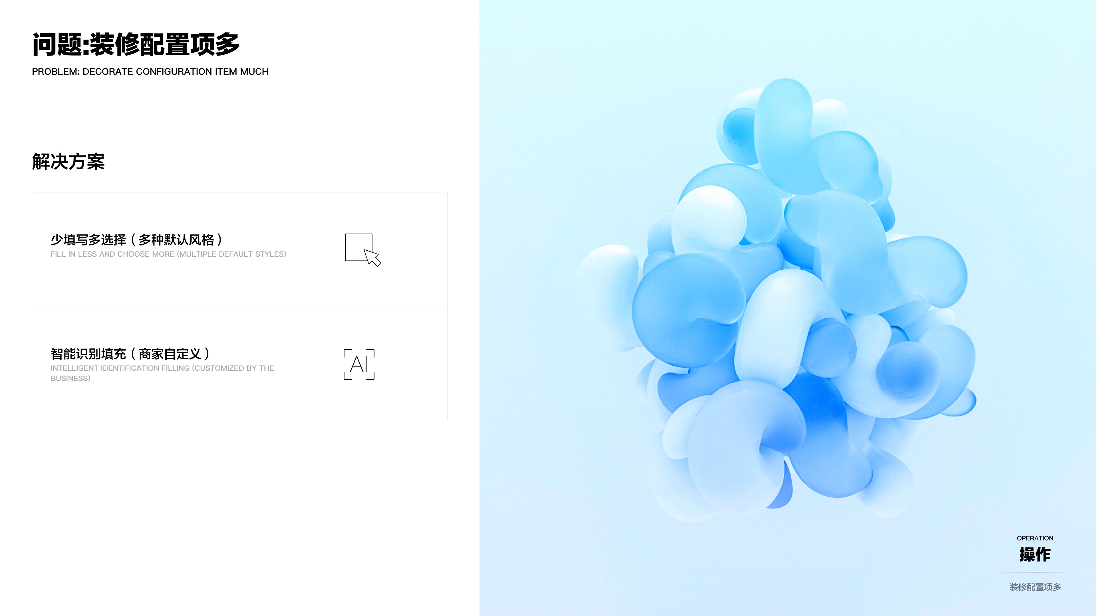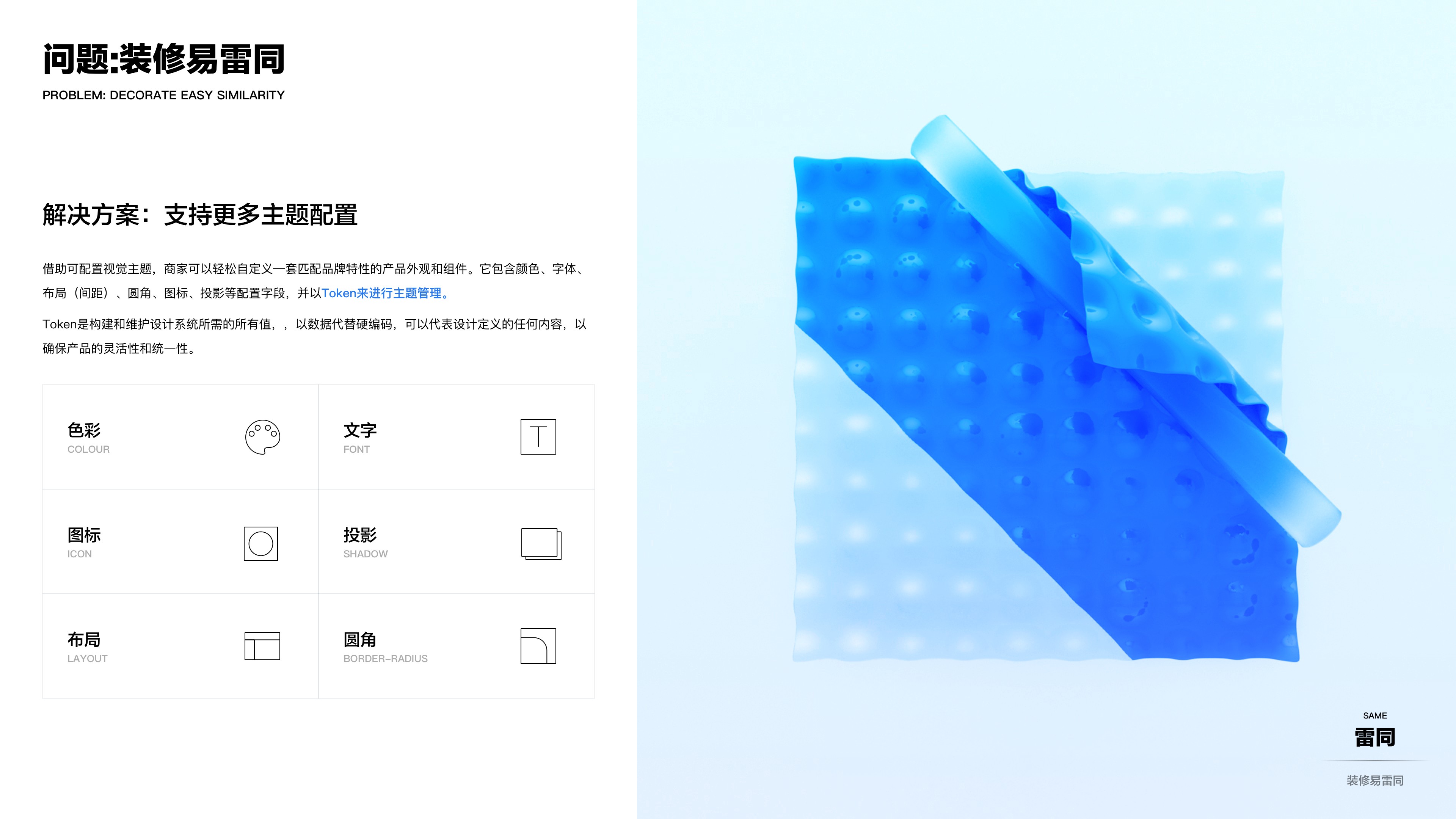 针对品牌风格透出不足、装修易同质化、配置项复杂、效果落地难四大核心问题,我们构建了一套系统性的解决方案:通过强化品牌标志与场景元素植入,提升品牌辨识度;搭建基于Token的可配置主题体系,支持色彩、字体、布局等多维度自定义,解决行业同质化问题;以“少填写多选择”的默认风格预设与智能识别填充功能,大幅降低用户配置成本;同时提供包含模板、示例及图标、拍摄、色彩等全套装修规范指南,为用户提供从品牌表达、差异化配置、高效操作到效果落地的全链路支持,在保障设计灵活性与统一性的同时,全面提升用户的使用体验与品牌的差异化竞争力。