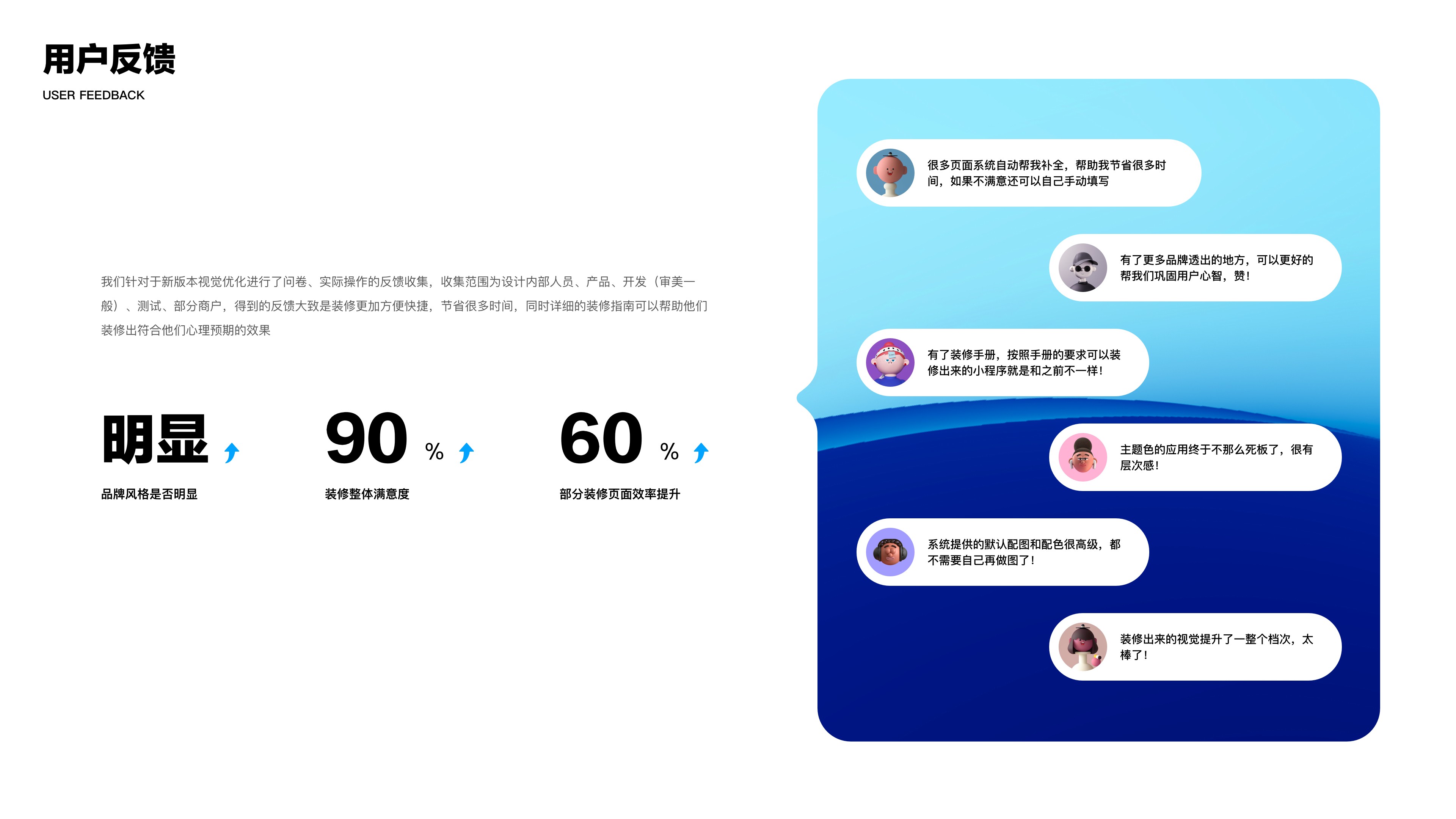 新版本设计优化获得了显著成效:通过面向设计、产品、开发、测试及商户的问卷与实操反馈,用户普遍认可系统自动填充、品牌透出、主题色应用及装修手册带来的便利与效果提升;数据层面,品牌风格辨识度、装修整体满意度及部分页面效率均实现大幅增长,证明本次优化成功解决了用户痛点,有效提升了操作效率与视觉呈现效果。
