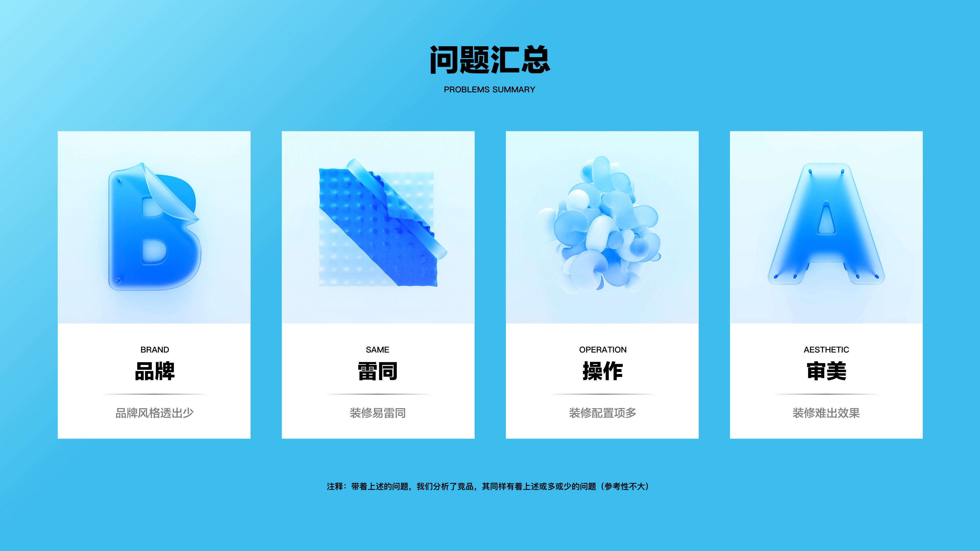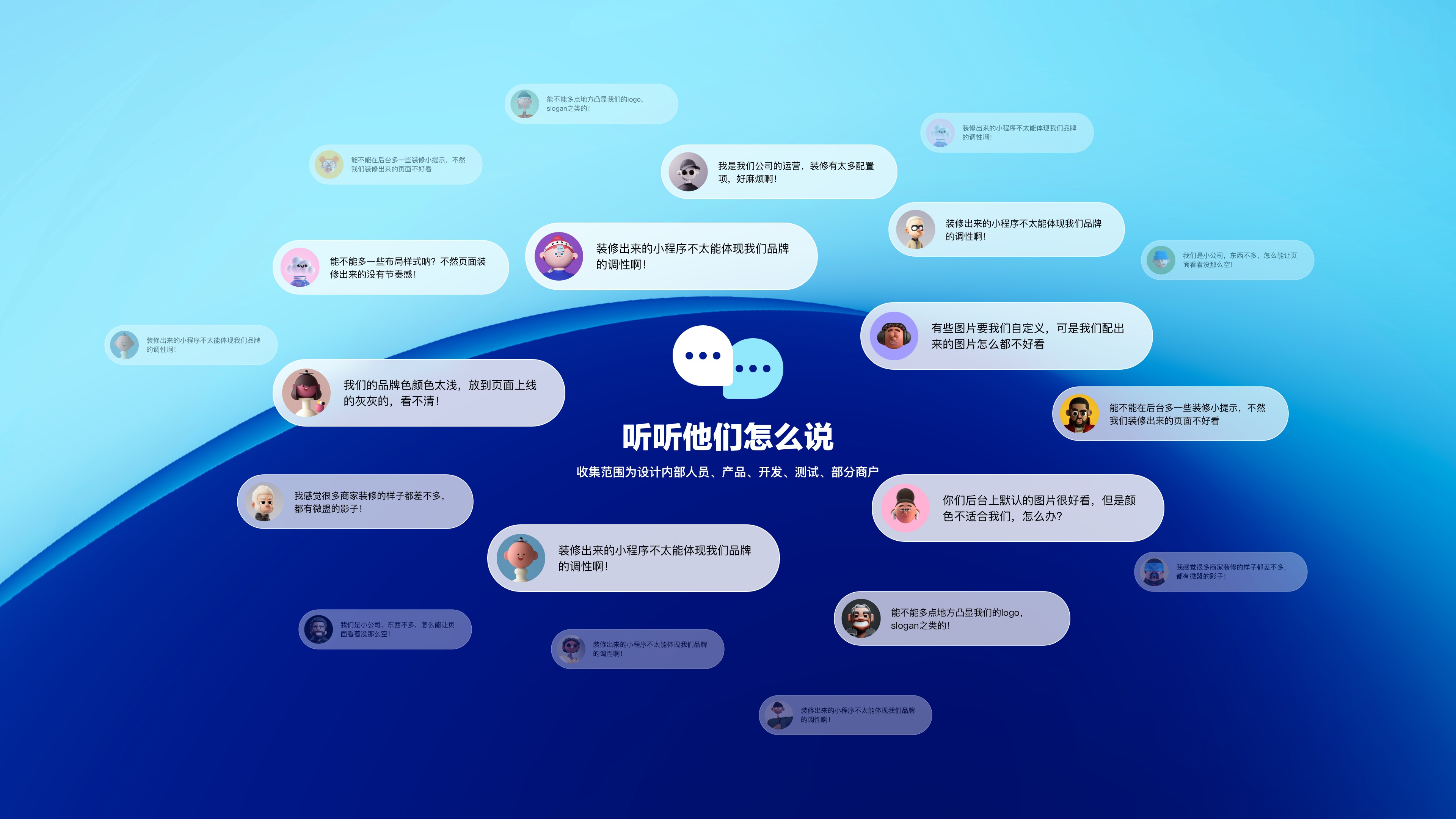 本次调研面向设计、产品、研发、测试及部分商家用户,通过收集一手反馈,聚焦四大核心痛点:品牌风格透出不足,商家难以在装修中凸显品牌调性与标识;行业同质化严重,大量店铺风格趋同,缺乏差异化;配置流程繁琐,过多选项提升了用户的操作门槛;效果落地困难,商家对图片、色彩等元素的处理能力不足,难以实现理想呈现。这些反馈为后续设计语言的迭代提供了明确的优化方向。