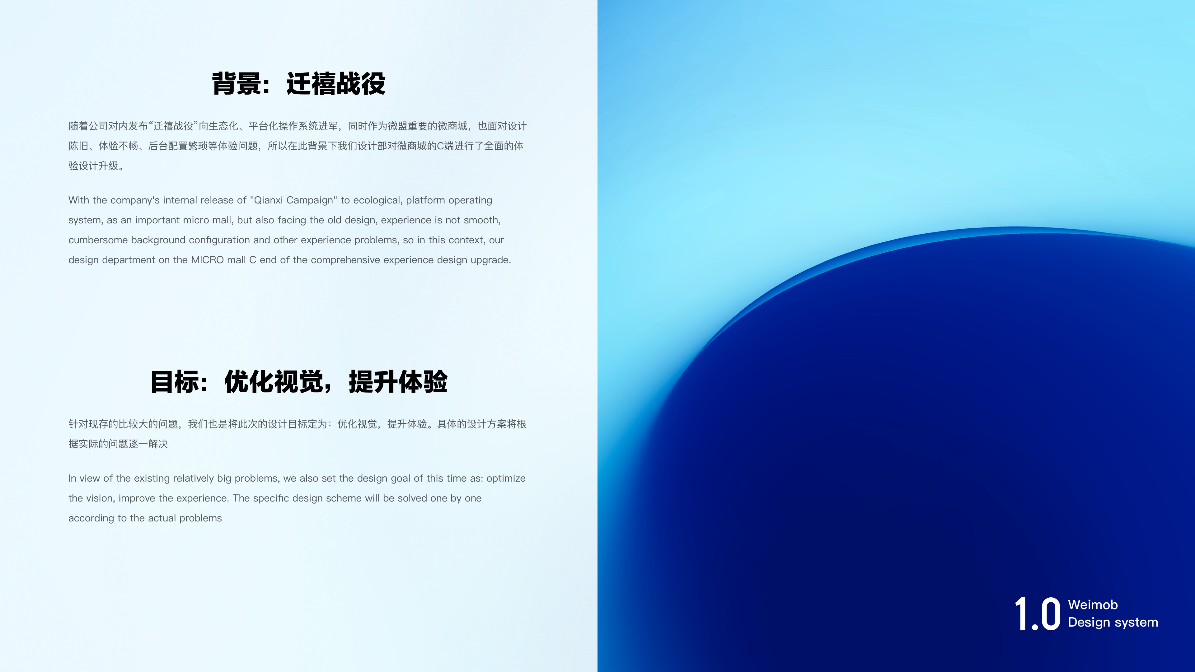基于公司“迁禧战役”向生态化、平台化操作系统升级的背景,微盟微商城针对设计陈旧、体验不畅、配置繁琐等问题,启动了以“优化视觉、提升体验”为目标的C端全面体验设计升级。